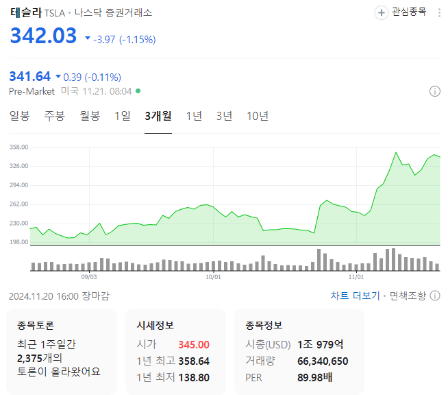 최근 미국 대선 결과로 인해 테슬라의 주가가 요동치고 있는데요,