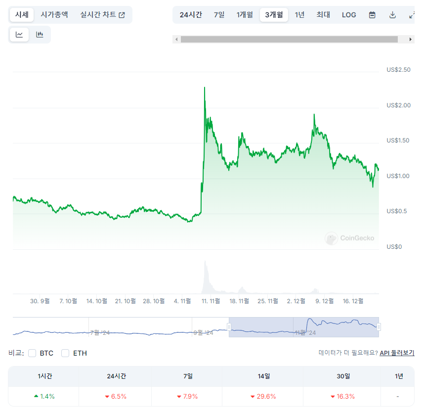 업비트 상장 이후 최고가는 약 3,950원까지 상승했으나 현재는 약 1,800원 수준에서 변동세를 보이고 있습니다.