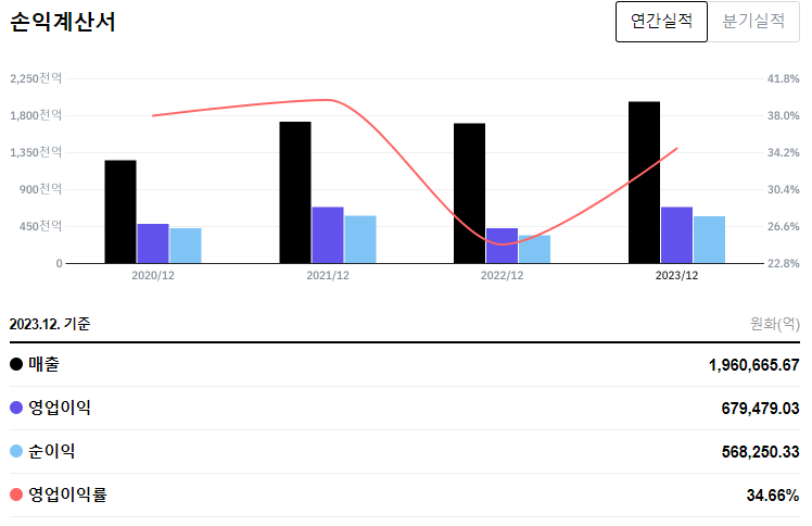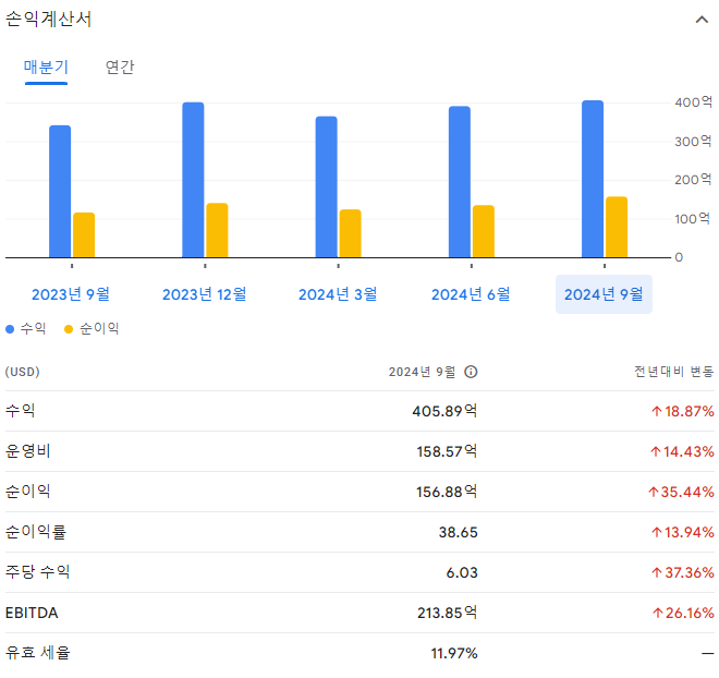 2023년 4분기 실적에서 매출 401억 달러, 순이익 140억 달러를 기록하며 시장 예상을 상회하는 성과를 보였습니다.