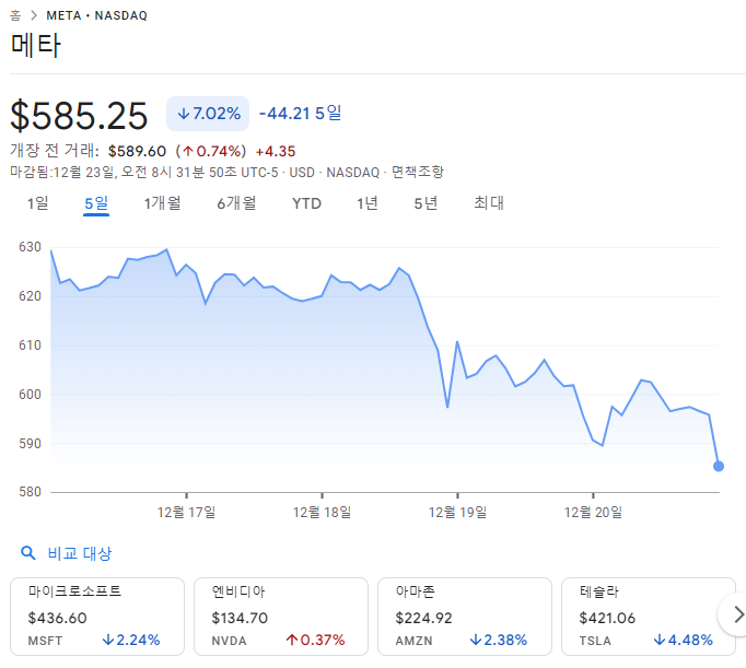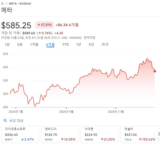메타 주식은 2024년 동안 강한 상승세를 보였으나, 최근 소폭 조정을 겪고 있습니다.