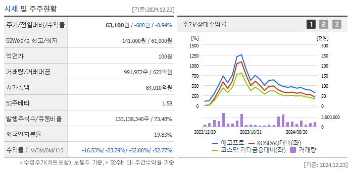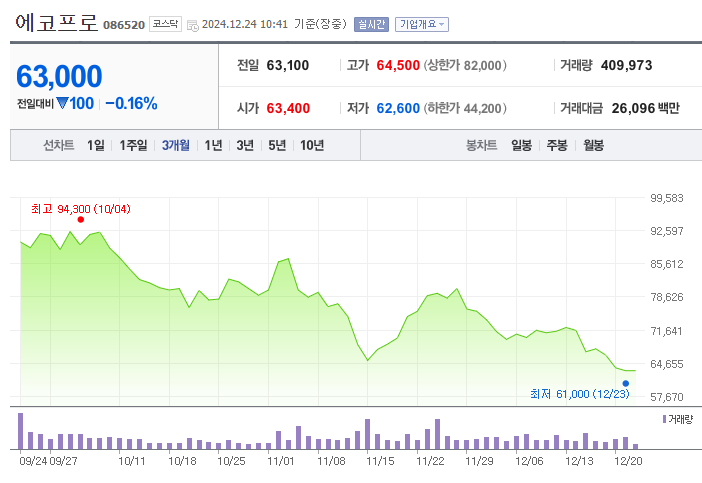 에코프로의 현재 주가는 약 63,200원으로, 최근 하락세를 보이고 있습니다.