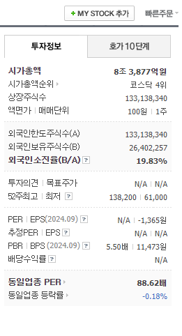 52주 최고가 138,200원에 비해 크게 떨어진 상태입니다.