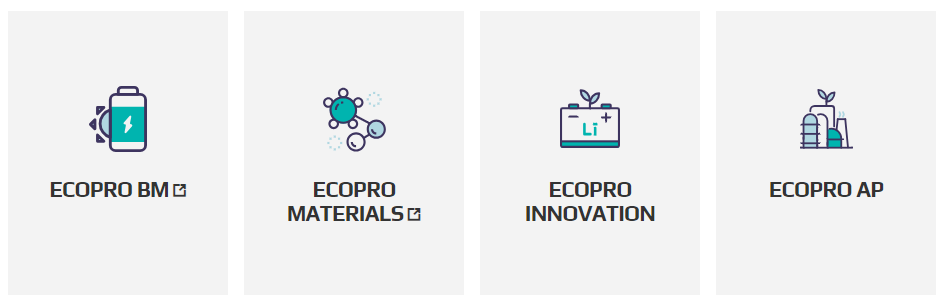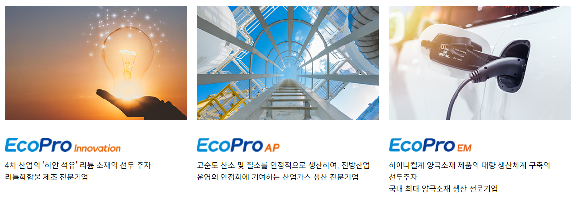 에코프로비엠(양극재), 에코프로머티리얼즈(전구체), 에코프로에이치엔(환경사업) 등 자회사를 통해 2차전지 소재 생태계를 구축하고 있습니다.