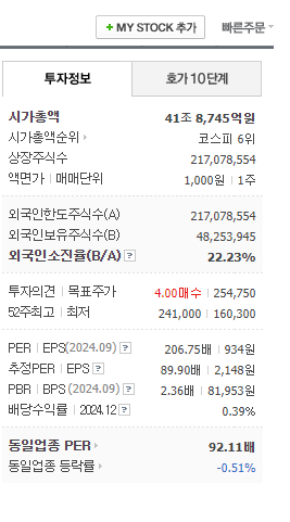 52주 최고가는 241,000원 최저가는 160,300원 입니다.