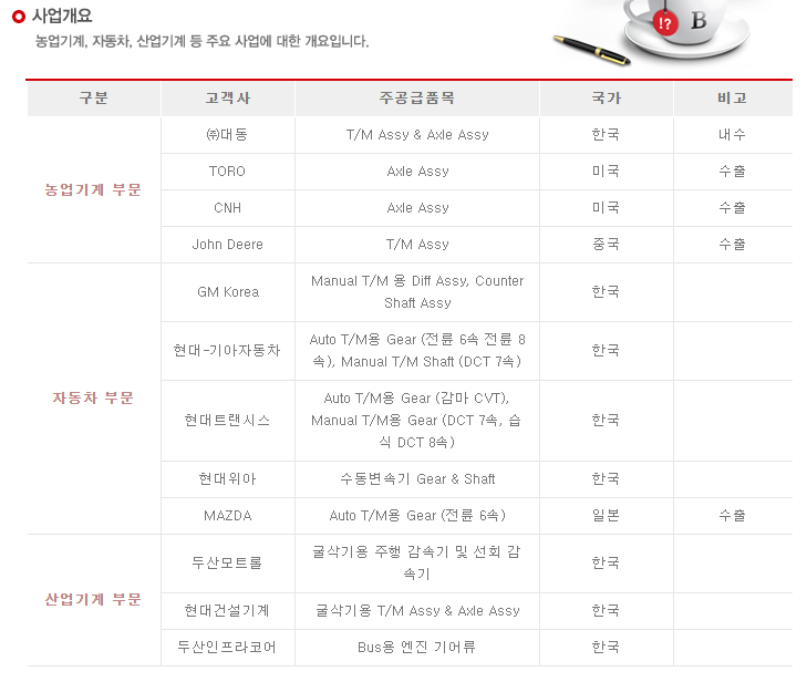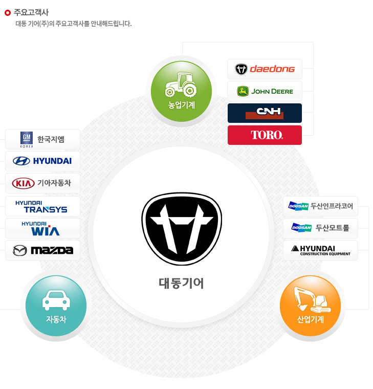 주로 농업기계, 자동차, 산업기계 등에 사용되는 부품과 트랜스미션을 생산하고 있죠.