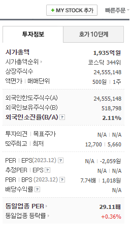 52주 최고가는 12,700원, 최저가는 5,660원이며, 연초 대비 약 64% 상승했습니다.