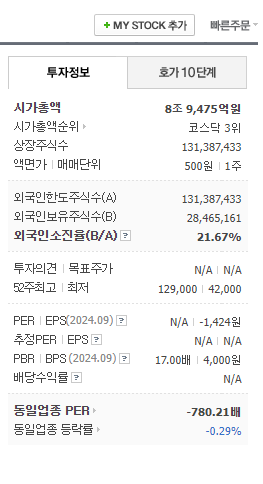 52주 최고가는 129,000원, 최저가는 42,000원입니다.