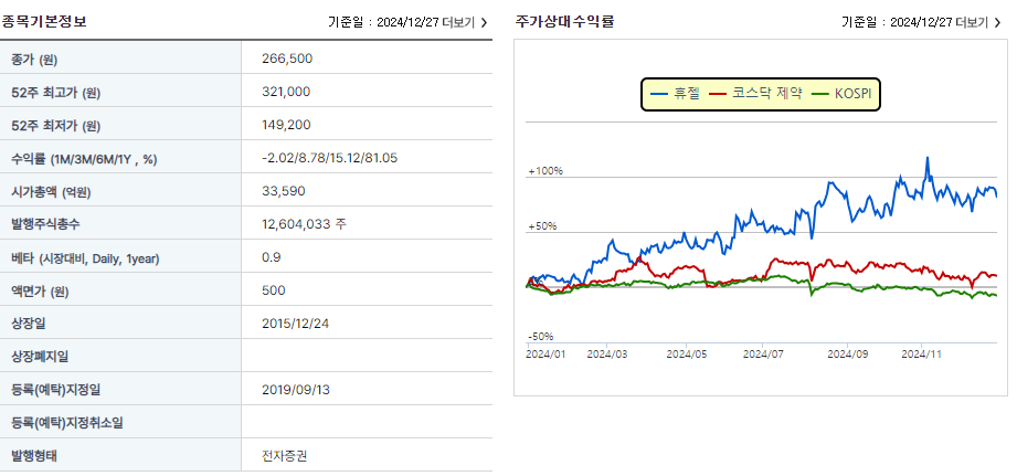 2024년 12월 30일 기준으로 휴젤의 주가는 약 275,000원입니다.