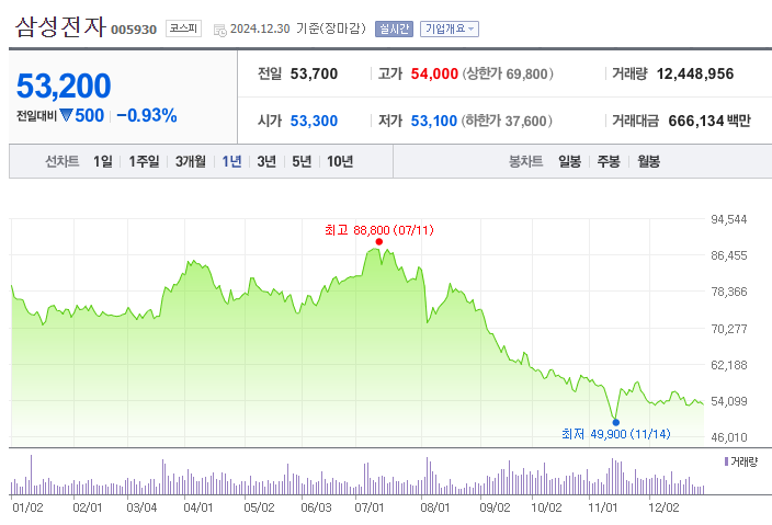 2024년 12월 31일 기준 삼성전자의 주가는 약 53,200원입니다.