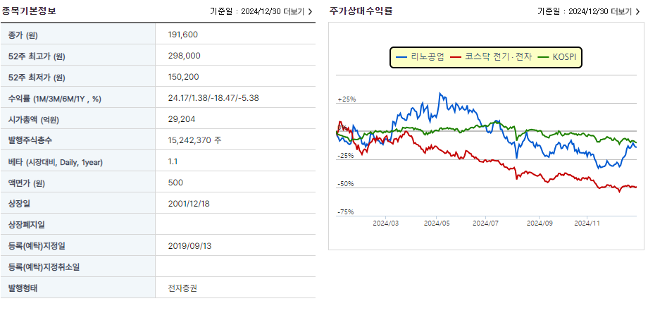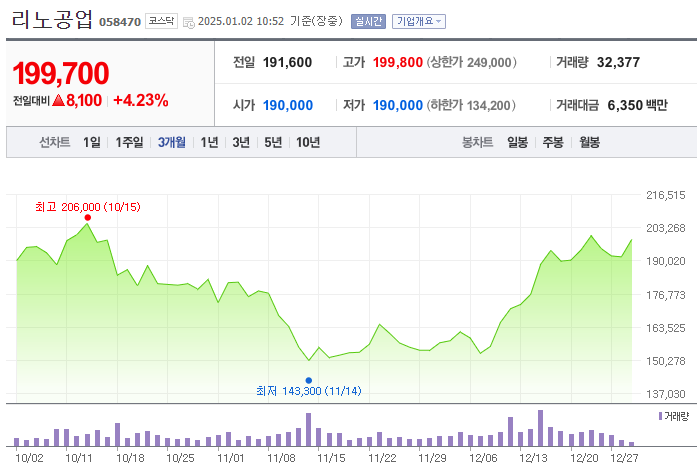 그 결과, 2025년 1월 2일 기준으로 리노공업의 주가는 약 200,000원까지 올라왔습니다.