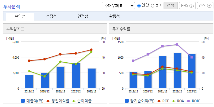 - 높은 수익성: 영업이익률이 45%를 넘는 높은 수준을 유지하고 있습니다.