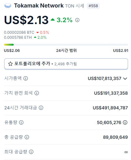 토카막 네트워크(TON)의 현재 가격은 약 2.09달러입니다.