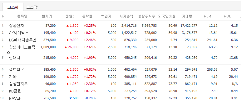 1 | 삼성전자 | 3,414,716 | 57,200 |