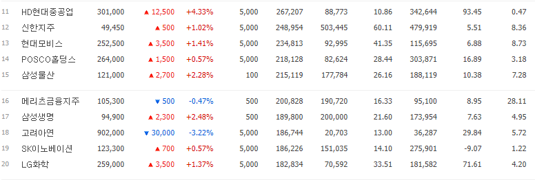 먼저, 현재 코스피 시가총액순위를 표로 정리해봤습니다.