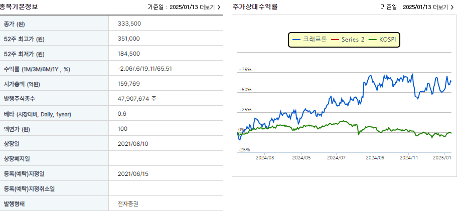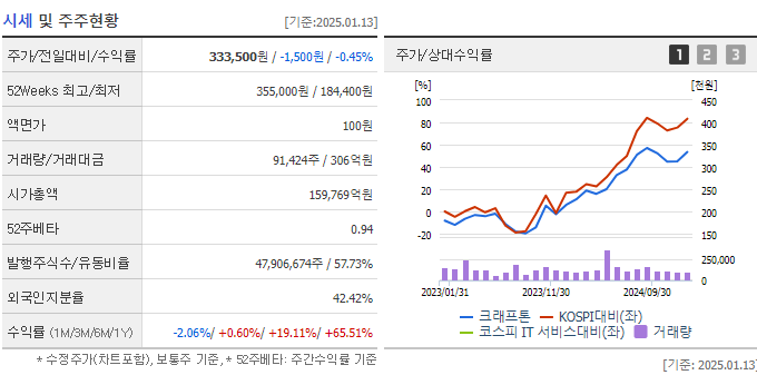 2025년 1월 14일 기준, 크래프톤의 주가는 약 343,500원을 기록했습니다.