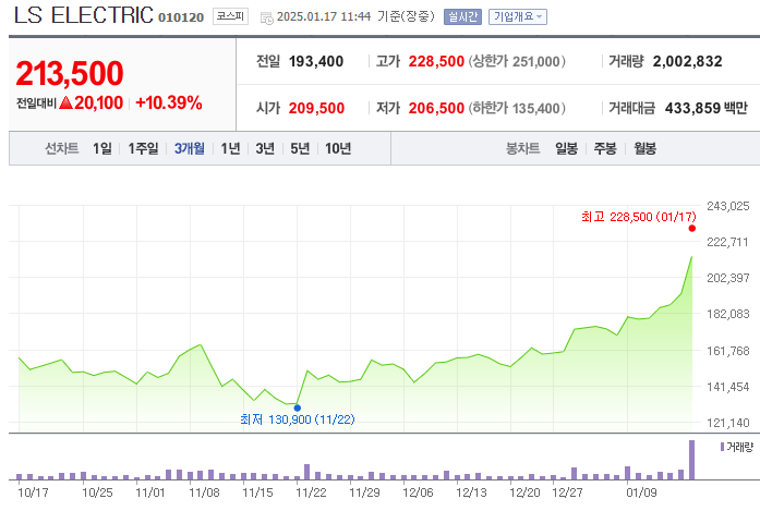 2025년 1월 17일 기준, LS ELECTRIC의 최신 주가 동향은 다음과 같습니다: