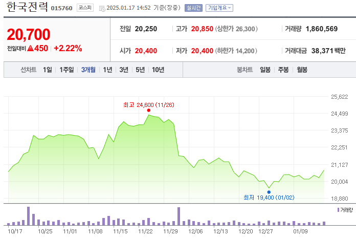 2025년 1월 17일 기준, 한국전력의 주가는 20,750원을 기록하고 있습니다.