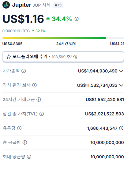 현재 주피터(JUP)의 시세는 $1.17입니다. 지난 24시간 동안 약 35% 상승했네요.