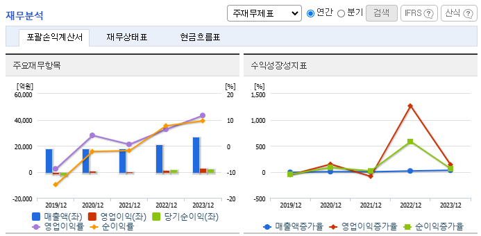 2024년 실적은 매출 3조 3223억 원, 영업이익 6690억 원으로 전년 대비 각각 22.9%와 112.2% 증가했습니다.