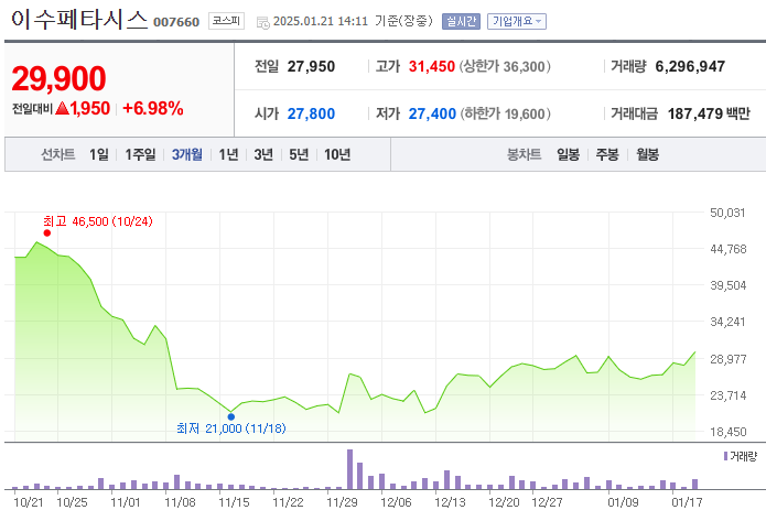 2025년 1월 17일 기준, 이수페타시스 주가는 28,350원으로 전일 대비 6.58% 상승했습니다.