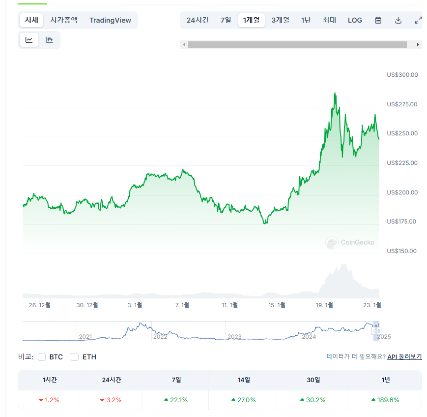 솔라나(SOL)의 시세가 최근 급격한 변동을 보이고 있습니다. 2025년 1월 23일 기준, SOL의 가격은 약 246 달러를 기록하며 전주 대비 약 22% 상승했습니다. 이는 도널드 트럼프 미국 대통령 당선인의 밈코인 발행과 밀접한 관련이 있습니다.