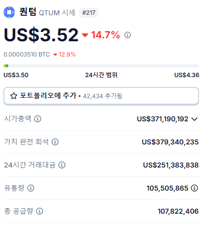 최근 퀀텀코인의 시세는 변동이 심한 편입니다. 현재(2025년 2월 2일 기준) 퀀텀의 가격은 약 3.5달러로입니다.