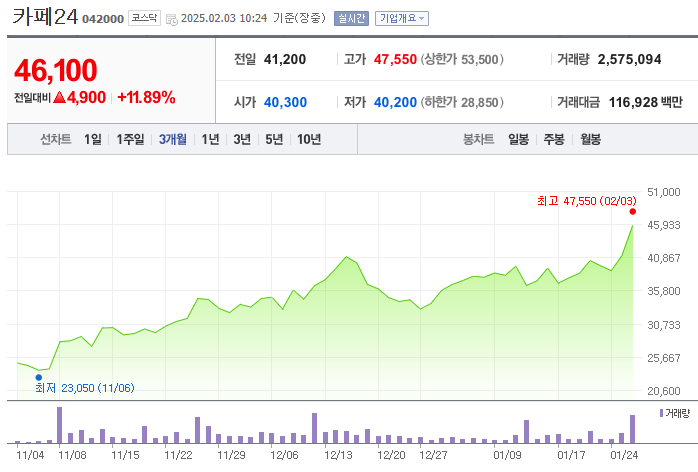 2025년 2월 3일 기준, 카페24의 주가는 약 46,100원에 거래되고 있습니다.