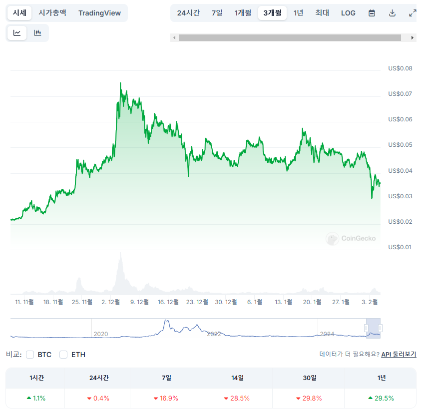 지난 7일간 약 17% 하락했습니다. 이는 전반적인 암호화폐 시장의 조정과 맞물려 있는 현상으로 보입니다.
