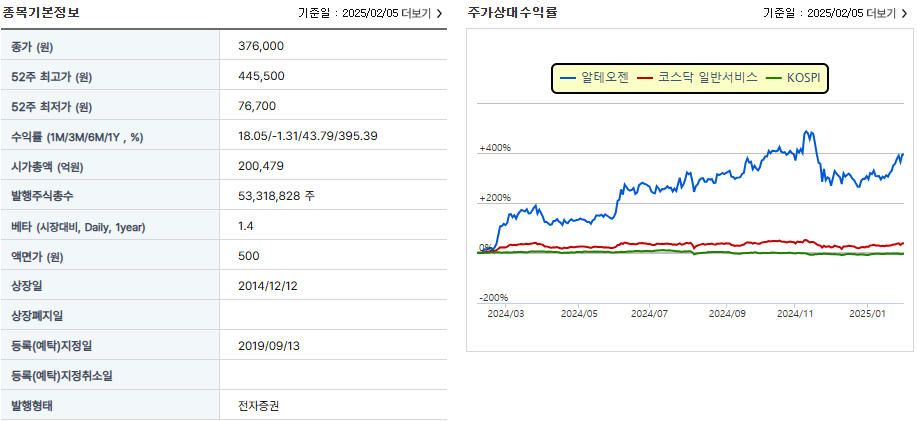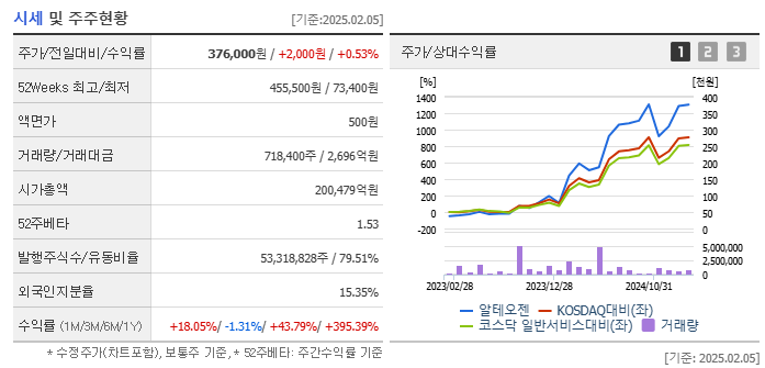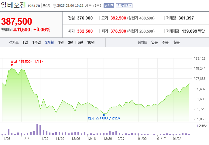 2025년 2월 6일 기준, 알테오젠의 주가는 약 387,500원을 기록하고 있습니다. 최근 주가는 변동성이 크게 나타나고 있으며, 이는 회사의 기술력 인정과 시장의 기대감, 그리고 일부 우려 요인들이 복합적으로 작용한 결과로 분석됩니다.