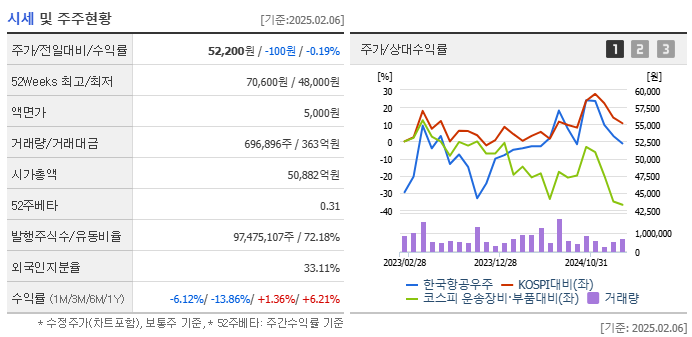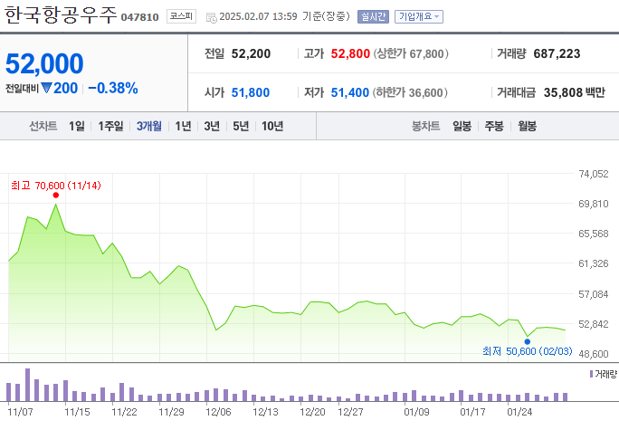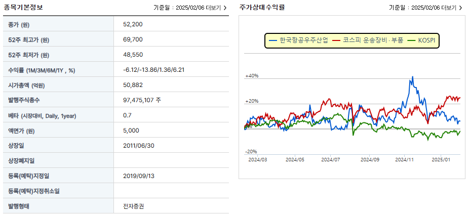 2025년 2월 7일 기준, 한국항공우주의 주가는 약 52,000원을 기록하고 있습니다. 최근 주가는 변동성을 보이고 있으며, 이는 방산 산업의 성장과 글로벌 경제 불확실성이 복합적으로 작용한 결과로 분석됩니다.