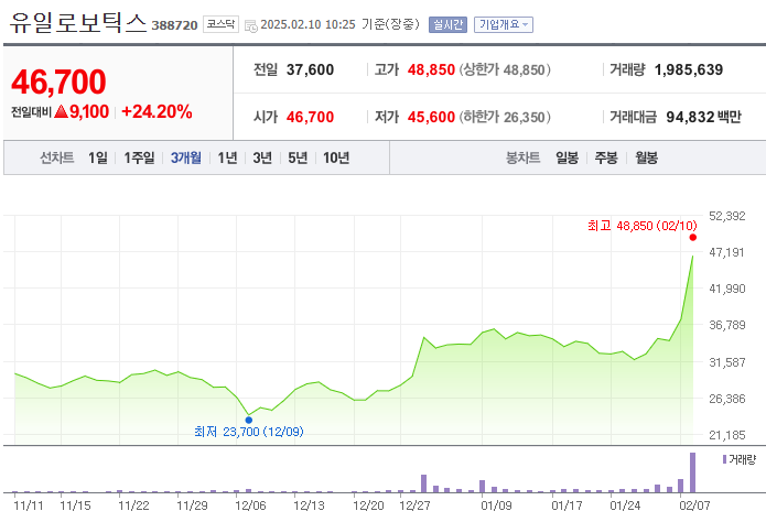 2025년 2월 10일 기준, 유일로보틱스의 주가는 약 46,700원을 기록하고 있습니다. 최근 주가는 상승세를 보이고 있으며, 이는 로봇 산업의 성장과 SK그룹의 로봇 프로젝트 관련 소식이 긍정적으로 작용한 결과로 분석됩니다.