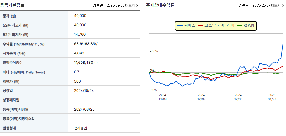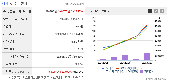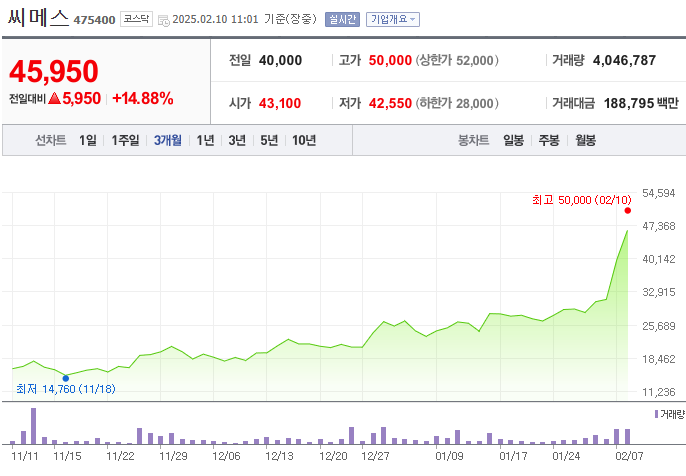 2025년 2월 10일 기준, 씨메스의 주가는 약45,950원을 기록하고 있습니다. 최근 주가는 급등세를 보이고 있으며, 이는 AI와 로봇 산업에 대한 관심 증가와 회사의 기술력 인정에 기인한 것으로 분석됩니다.