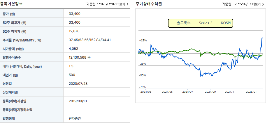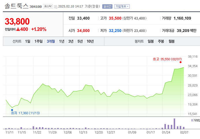 2025년 2월 10일 기준, 솔트룩스의 주가는 33,800원을 기록하고 있습니다. 최근 주가는 상승세를 보이고 있으며, 이는 AI 산업의 성장과 중국 AI 스타트업 딥시크의 저비용 고성능 AI 모델 공개 소식이 긍정적으로 작용한 결과로 분석됩니다.