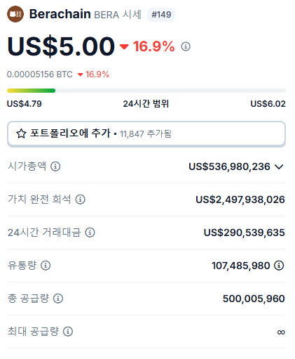베라체인(BERA)은 2025년 2월 6일 업비트를 포함한 주요 거래소에 상장하며 큰 주목을 받았습니다. 상장 초기 가격은 15.5달러(약 2만2400원)로 시작했으나, 차익 실현 매물로 인해 현재 5달러 수준으로 조정되었습니다. 상장 첫날 거래량은 약 48억 달러(약 6조9600억 원)에 달하며 폭발적인 관심을 보여주었습니다.