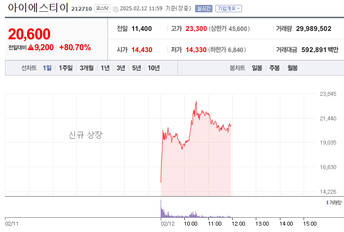 아이에스티이의 상장 첫날 현제 주가는 공모가 11,400원 대비 약 80% 급등한 20,600원입니다. 이는 투자자들의 높은 관심과 기대감을 반영한 결과로 볼 수 있습니다.
