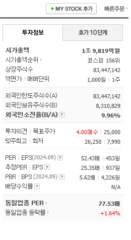 - 2025년 1월 16일: 24,300원 (고가 24,750원, 저가 23,950원)