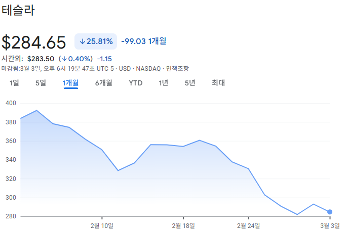 2025년 3월 현재, 테슬라의 주가는 하락세를 보이고 있습니다. 최근 주가는 284.65달러 수준에서 거래되고 있습니다.이는 한달전에 배해 약 26% 하락한 수치입니다.주가 하락의 주요 원인으로는 단기 재무 실적 악화, 내부자 매각, 엘론 머스크의 경영 행보, 거시경제 리스크, 그리고 경쟁 심화 등이 꼽힙니다.