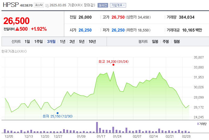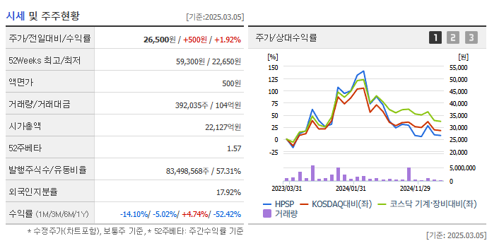 2025년 3월 5일 기준, HPSP의 주가는 26,500원을 기록하고 있습니다. 최근 주가 흐름을 살펴보면 다음과 같습니다: