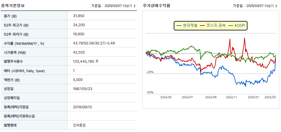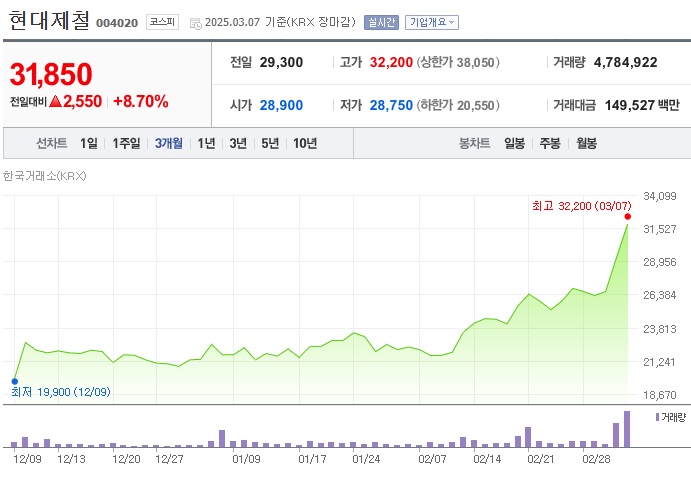 2025년 3월 7일 기준, 현대제철의 주가는 31,850원으로 전일 대비 8.7% 상승했습니다. 이는 외국인과 기관의 적극적인 투자와 미국 정부의 관세 정책 완화 기대에 따른 것입니다.