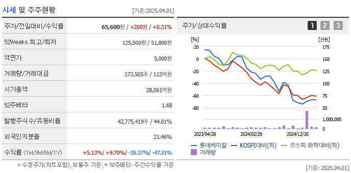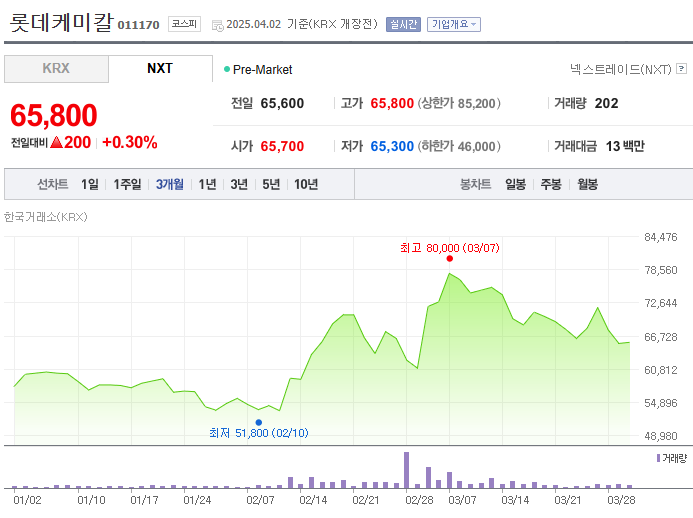 2025년 4월 1일 기준 기준, 롯데케미칼의 주가는 6만 5,800원으로 거래되고 있으며, 최근 몇 주 동안 하락세를 보이고 있습니다.