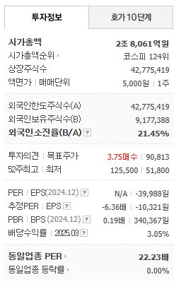 - 장기 하락세: 과거 최고점(32만 원) 대비 약 81% 하락한 수준으로 여전히 낮은 평가를 받고 있음.