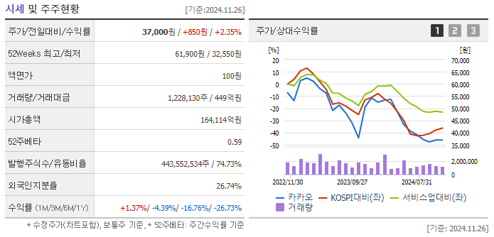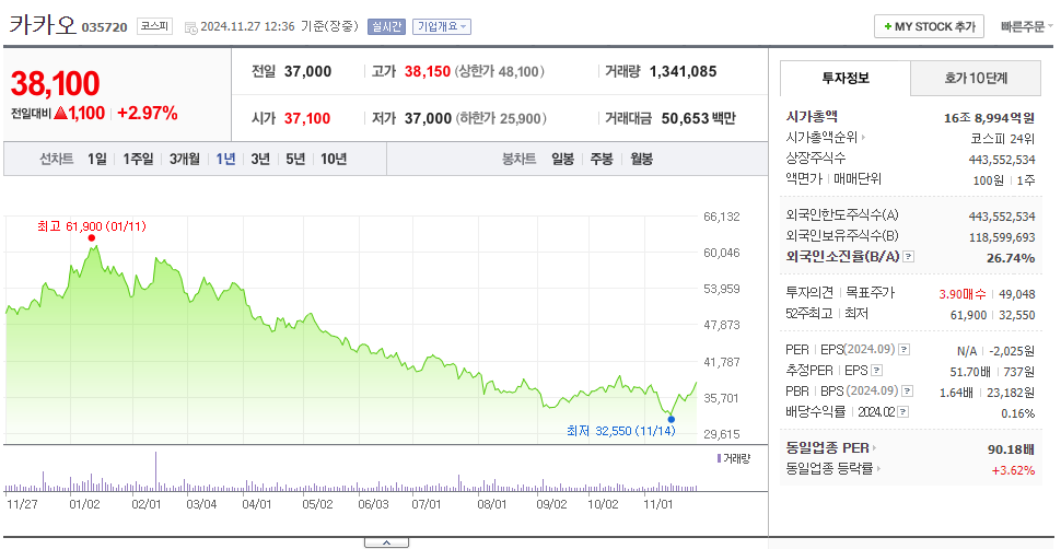 2024년 11월 현재 3만원 후반대로, 52주 최고가 61,900원에서 크게 하락했습니다.