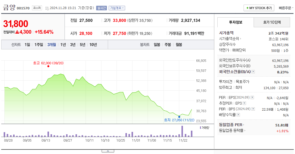 2024년 11월 28일 기준으로 금양의 주가는 3만 원 초반대로 전일 대비 15%가량 상승한 수치입니다.