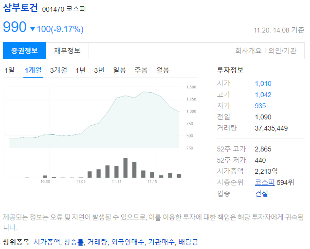 특히 11월 초부터 삼부토건의 주가가 급등하는 모습을 보였는데요.