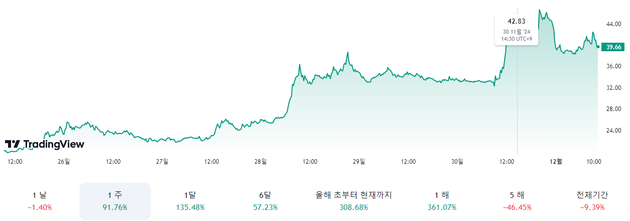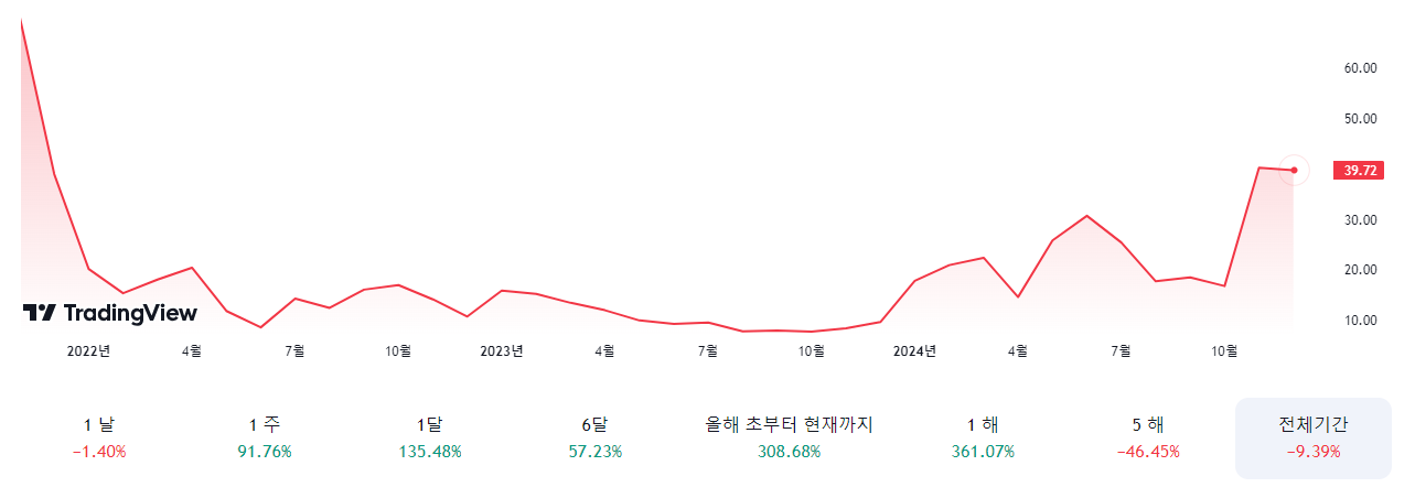 2024년 11월 말 기준 약 40달러로 전년 대비 205% 이상 상승했습니다.