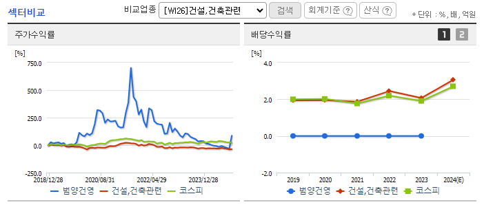 건설업 특성상 경기 변동에 민감하고, 최근의 급등세가 지속될지는 미지수입니다.