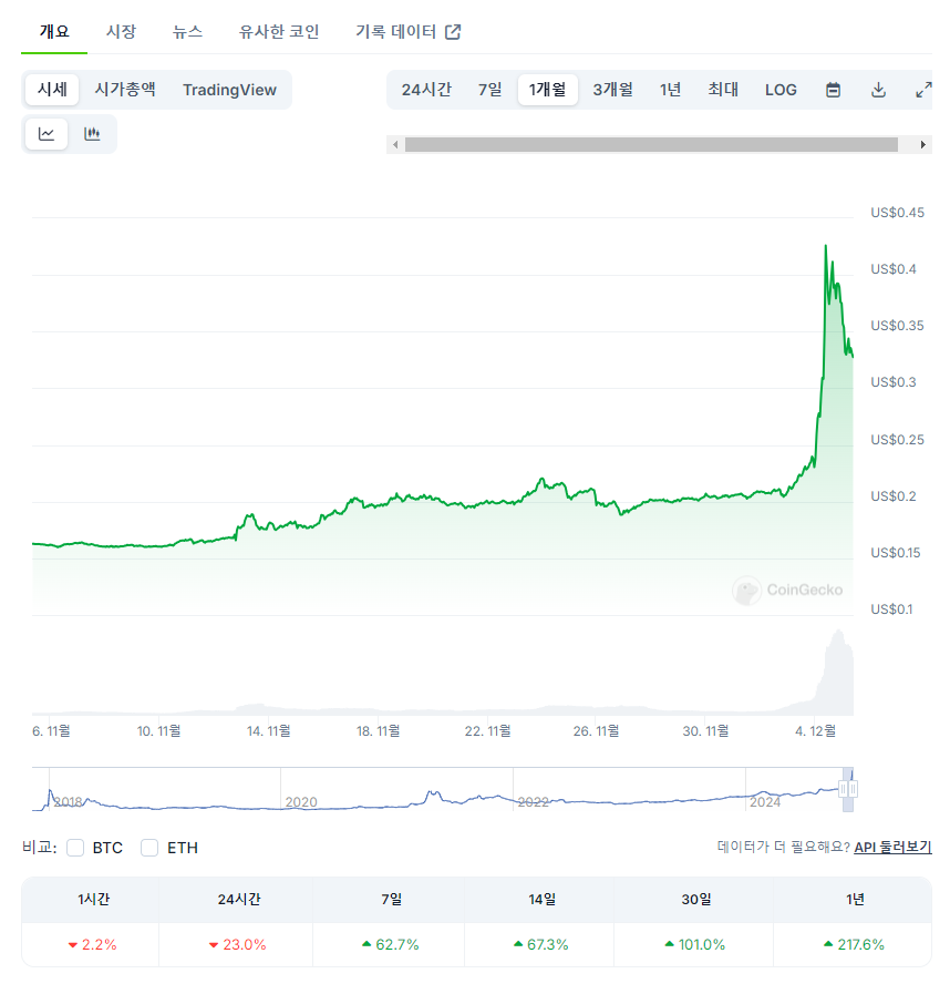 - 높은 변동성: 최근 60% 급등 사례처럼 가격 변동이 매우 크다.
