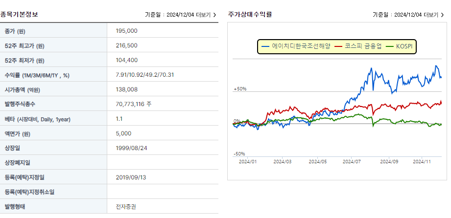 최근 실적 개선과 조선업 호황으로 주가가 상승세를 보이고 있으며, 52주 최고가는 219,000원, 최저가는 10,4000원입니다.