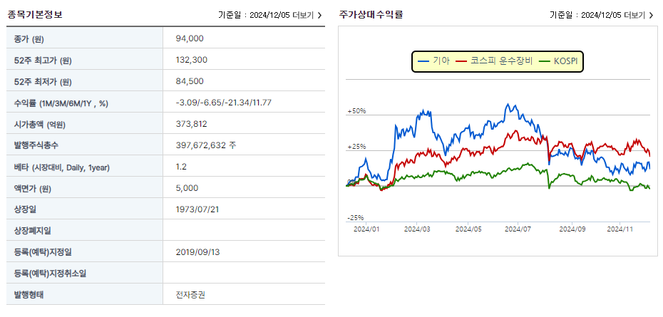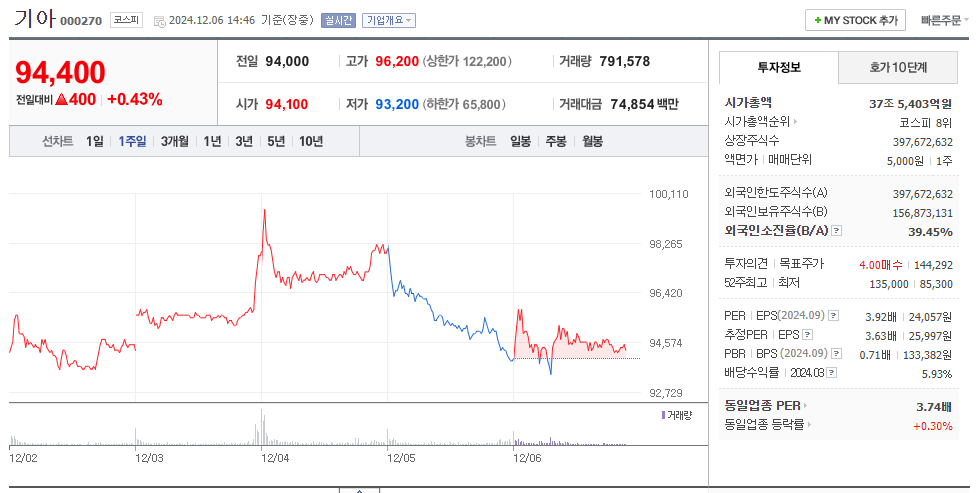 기아의 12월초 최신 주가는 약94,000원이며 전주 대비 4.03% 상승한 수치입니다.