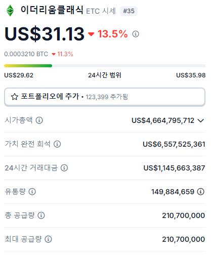 현재 ETC의 가격은 31 USD로, 24시간 동안 약 13.5% 하락했습니다.